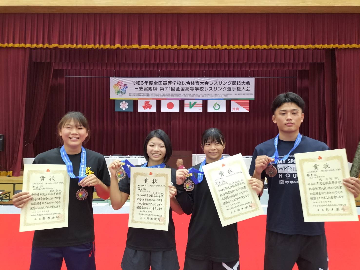 令和6年度全国高等学校総合体育大会レスリング競技大会 女子 小川 凜佳 優勝 小川 璃苑 3位 坂井 愛 3位 男子 堤 大智 3位